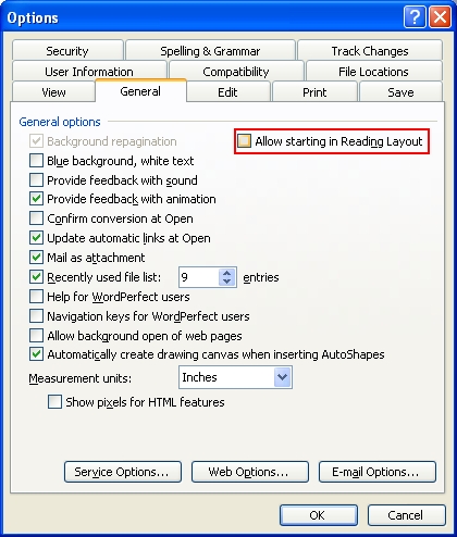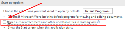 By default, Microsoft Word uses 'Reading Layout' view when it opens documents that you receive as e-mail attachments. To prevent opening documents in 'Reading Layout' view, there is a setting that can be changed to avoid this.