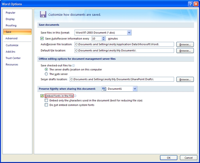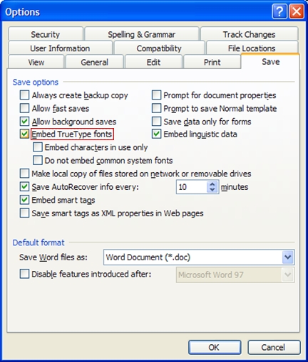 Microsoft Word includes an option to save the fonts that are used in your document with the file. This option allows all readers to see the fonts in your document, even if they don’t have the fonts installed. This option increases file size, but should be used if it’s important that everyone reading your document sees your fonts the same way.