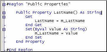 A truly nifty feature of the Visual Studio .NET code editor is the concept of regions. You can create named regions directly in your source code. You can then expand and collapse regions in the editor to hide or show code based on its type. For example, you could create a region called “Public Properties” and put all your property code there. Additional regions could support your public methods, and privates.